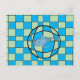 Grüne und blaue Schachbrett mit optischer Illusion eines 3D Balls in der Mitte. Der Spielzeugwal ist so positioniert, dass er durch die Haut des Balls schwebt.