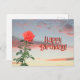 Single rosa Rosa rosa auf grünen Stamm grün, wird gegen einen Sonnenuntergangshimmel aufgehalten. Goldener Himmel unten und blau-grau oben. Rosa und graue Wolken sind über den Himmel verstreut. "Happy Birthday" ist in rosa Text mit einem schwarzen Schlagschatten (kann auf Ihre Empfindung geändert werden).