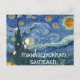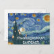 Wünschen Sie Ihren Freunden einen Thanksgivukkah Sameach (Happy Thanksgivukkah) mit dieser parody postcard. Diese Version, die von Van Gogh's Gemälde Starry Night abgespielt wird, hat Latkes, saure Creme, Flammen aus der Menorah und ein kleines dreiel.