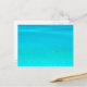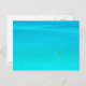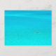 Postcard eines Mannes, der in einem Kanuboot in der hellblauen Lagune der tropischen Insel Bora Bora bei Tahiti im Pazifik paddelt.