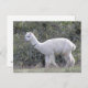 Weiße Alpaka stehend in der Nähe von Büstenbürste. Das Sonnenlicht hebt die Konturen des Tieres gegen das dunkle Blattwerk hervor.