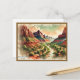 Hier ist eine Vintage Gebirgslandschaft Postkartendesign mit Retrofarbenpalette und nostalgischem Ambiente.
