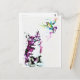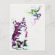 Wasserfarben wurden benutzt, um die Bilder eines Kätzchens zu machen, das einen Kolibri über sich fliegt. Dies ist ein Druck auf eine Postkarte.