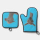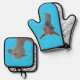 Weiße Alpaka-Portraits. Anderes Tier auf dem Topfhalter und Ofen Mitt. Hintergrund ist Himmelblau.