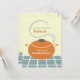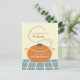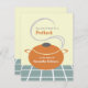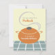 Eine Party Einladung mit Pflücken, die eine Abbildung eines orangefarbenen Kochtopfes mit Griffen und Deckel enthält. Der Töpfchen sitzt auf einer blauen und weißen Oberfläche und hat Dampf, der unter dem Deckel kommt. Personalisieren Sie den Text vorne und hinten. Zurück zeigt blaues Oberflächenbild unten.