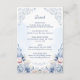 This romantic wedding details design features powder blue watercolor florals, soft blush accents, and delicate vintage-inspired scrollwork. The graceful layout is ideal for sharing reception, accommodation, RSVP, and wedding website information in a polished and elegant way. Its airy botanical styling suits classic, formal, garden, and timeless wedding themes beautifully. The soft blue palette and ornate floral framing make it a lovely coordinating piece for a refined wedding stationery suite.