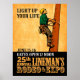Plakatbild eines elektrischen Power-Lineman-Offiziers, der auf den elektrischen Versorgungspol klettert und von einer Seite mit den Worten des internationalen lineman rodeo grunge Stil betrachtet wird