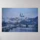 Ein schöner Winterblick auf die Prager Burg, die Strakova akademie, den Fluss Moldau und die Tschechische Brücke. Auf dem links die Touristenboote, die Reisende auf einer Aussichtstour im Sommer. Schneefräse, verschneite Dächer der berühmten Gebäude.
