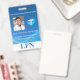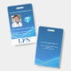 Praktisches Abzeichen für vertikale Lizenz (oder andere, wie Sie Initialen und Jobbeschreibung durch Verwendung von Textfeldern ändern können) Foto-ID. Design mit blauem Hintergrund mit abgerundetem Wellenlichtdesign - Design, das von Postern schwer zu reproduzieren ist - Behalt unser blauen und aquamarinen Herzlogos oder füge einfach dein eigenes Firmenlogo mit unserem Vorlagenbild hinzu. LPN-Initialen unten blau über weißem rechteckigem Streifen HINWEIS: Wenn Sie ein BUDDY SYSTEM verwenden: Weißes Rechteck und Initialtexte können auf andere Farben geändert werden, indem Sie weitere Einstellungen vornehmen. Id mit Foto, Name, Firma/Krankenhaus-Name und ID-Nummer. Zurück mit Informationsbereich für den Fall, dass Abzeichen verloren geht. Ebenfalls verfügbar in horizontaler Präsentation.Für alle Ärzte in den Linien, DANKE FÜR IHREN PHANTASTISCHEN SERVICE!