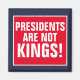 Präsidenten sind keine Könige, aber wenn sie für alles, was als "offizielle Tat" gilt, volle Immunität vor Strafverfolgung haben, macht ein Präsident wie ein König. Egal welches Party Sie unterstützen, wenn Sie Patriot sind, sollten Sie keinen unrechenschaftspflichtigen Präsidenten mit den Powern eines Königs gewollt haben. Beschreibung des Designs: Der Hintergrund ist tief in Mitternachtsblau. Hinzu kommt ein rotes Quadrat mit einem weißen Rand mit den Worten: "Präsidenten sind keine Könige!" in allen Kappen in einem weißen serifenlosen Schriftart.