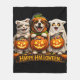 Ready for the ultimate spooky season snuggle with this trick or treat trio fleece blanket this high detail vibrant design features an adorable mummy kitten a happy pumpkin puppy and a ghostly cat all showing off their overflowing candy buckets set against a deep velvety black background with a bold happy Halloween banner this soft and warm throw is perfect for movie nights chilly autumn evenings or as a festive bedspread