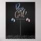 Junge oder Mädchen Gender-Prognose Spiel Poster. Traditionelles Spiel für das Geschlecht offenbart Party. Dunkles Design mit rosa und blauen Sternen, Fußabdruck und moderne Boy oder Girl Kalligraphie.