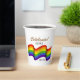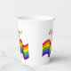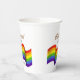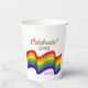 Diese PRIDE THEMED Paper Cups verfügen über das LGBTQ Flag. Über dem Flag steht der Text "Feiern!" und darunter ein Bereich für benutzerdefinierten Text.