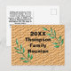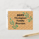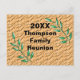 Erstellen Sie mit diesen einzigartigen Postkarten eine preiswerte Einladung für Ihre nächste Wiedersehen. Das Jahr und der Name Ihrer Familie erscheinen in der Mitte dieses runden Aufklebers. Der Text ist von Baumzweigen mit hellgrünen Blätter umgeben. Der braune Hintergrund ähnelt einem Korbgewebe oder einem gebrochenen Erdmuster. Die Rückseite dieser preiswerten Postkarte bietet viel Platz für Sie, um Ihre Veranstaltungsinformationen hinzuzufügen. Alle Texte können schnell und einfach personalisiert werden.