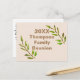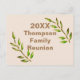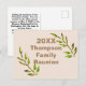 Erstellen Sie mit diesen einzigartigen Postkarten eine preiswerte Einladung für Ihre nächste Wiedersehen. Das Jahr und der Name Ihrer Familie erscheinen in der Mitte dieses runden Aufklebers. Der Text ist von Baumzweigen mit hellgrünen Blätter umgeben. Der hellbraune solide Hintergrund bildet die Grundlage für das gesamte Design und kann individuell angepasst werden. Die Rückseite dieser preiswerten Postkarte bietet viel Platz für Sie, um Ihre Veranstaltungsinformationen hinzuzufügen. Alle Texte können schnell und einfach personalisiert werden.