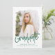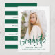 Trendy Graduation Party Einladungen mit dem Foto des Absolventen in einem texturierten Maskenrahmen mit "Graduate" in einem grünen handgeschriebenen Skript. Personalisieren Sie die Front der Foto Graduation Party lädt durch Hinzufügen des Graduiertennamens, der Schule und Abschluss Jahr. Die Einladung kehrt um, um Ihre Graduiertenpartien Details mit einem grün-weiß gestreiften Muster anzuzeigen.