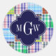 Preppy Patchwork Madras Navy Quatrefoil Monogram Runder Aufkleber
