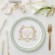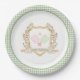 Set die Bühne mit diesen schönen, maßgeschneiderten Pickleball Geburtstagsparty Teller. Dieses Design hat ein Aquarellbild eines Wappen, umgeben von Ästen mit grünen und rosa Gingham-Paddeln in der Mitte. Es gibt eine grüne Gingham-Grenze um den Rand. Im Text steht: "Happy Birthday." Die verwendeten Farben sind moosgrün, rot-rot und braun.