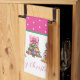 This cute Christmas holiday party kitchen dish towel features three preppy Christmas trees in girly shades of pink and green with fun bows at the top with a background of girly pink and white polka dots. Fun for your holiday party decor.