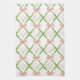 Dieses Küchentuch aus Pickleball hat ein grünes Trellis-Muster mit rosa Bögen und zwei Gingham-Paddeln, die in den Trellis kreuz durchquert werden. Die verwendeten Farben sind grün, rot und braun.