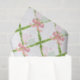 Dieses Taschentuch-Papier hat ein grünes Trellis-Muster mit rosa Bögen und zwei Gingham-Paddeln, die in den Trellis kreuzen. Die verwendeten Farben sind grün, rot und braun.