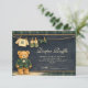 A charming preppy baby shower design featuring a sweet teddy bear dressed in a classic green plaid jacket and bow tie. Above the bear, a delicate clothesline displays tiny baby clothes and shoes, creating a nostalgic storybook nursery scene. The deep navy background and subtle tartan border add a refined, vintage-inspired touch that feels both elegant and playful. Perfect for a stylish baby shower celebration with a classic preppy aesthetic.