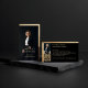 Elevate your professional image with this prestigious and elegant luxury business card template. Featuring a full photo layout with a sophisticated faux gold corner frame along the top and right edges, it creates a refined and high-end look. The reverse side offers a sleek all-black background with space for a second photo, continuing the gold frame, and room to add your name, title, contact details, and a QR code. Fully customizable, you can personalize your business name, tagline, colors, fonts, and images to perfectly match your brand. Ideal for real estate agents, law firms, business professionals, and anyone seeking a polished, luxurious impression, this template combines style, sophistication, and functionality in one striking design. Design and layout by ©Moodthology Papery