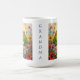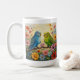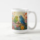Cute personalized coffee mug for bird lovers with impasto painting style blue and green parakeets and flowers.