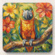 A sweet coasters with an impasto painting style parrot and colorful coral and yellow tropical flowers.