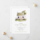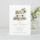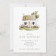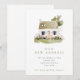 A pretty new address/new home announcement with a watercolor illustration of a cottage with front yard with gress and colorful wildflowers.