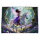 A beautiful African-American fairy in purple riding on a white magical unicorn through an enchanted forest. Pretty fairy tale forest themed girl's birthday gift bag.