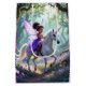 A beautiful African-American fairy in purple riding on a white magical unicorn through an enchanted forest. Pretty fairy tale forest themed girl's birthday gift bag.