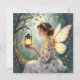 A beautiful blank card with a fairy holding a lantern on a magical night in an enchanted forest. Pretty watercolor floral details.