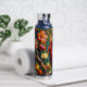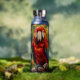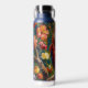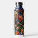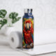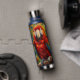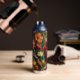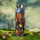 A bird themed water bottle with an impasto painting style colorful red, blue and yellow Macaw and flowers.