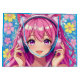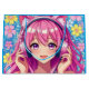 Pretty pink anime girl with headphones with cat ears themed birthday party gift bag. Cute for pre-teen girls that like gaming and music! Pink, blue floral background.