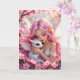 A pretty pink anime elven fairy holding her cute white baby dragon birthday card.