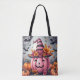 A cute pink and black striped witches hat on a cute pink pumpkin with a bat background Halloween trick or treat bag.