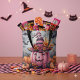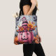 A cute pink and black striped witches hat on a cute pink pumpkin with a bat background Halloween personalized trick or treat bag.