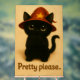 A sweet digital painting of a black cat wearing a red wizard hat, gazing up with big, pleading eyes and holding its tiny paws together as if saying “Pretty please.”