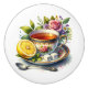 Pretty ai art depicting a pretty antique teacup full of tea with a lemon wedge and sugar cubes and roses on the side kitchen cabinet knob.