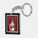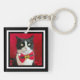 This Christmas keychain features an adorable tuxedo cat wearing a red bow tie on a red background. The photo is edged in white and black to bring out the distinguished nature of the tuxedo cat. Copyright Peaches the Tuxedo Cat