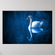In lovely nature scene of a white swan swimming on peaceful blue lake. The dark blue shadows contrasts nicely with the soft lighting on this peaceful swan.