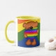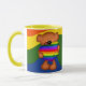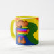 Niedliche Tasse / Kaffeetassen / Brillen / Steine / Reiseschlösser eines kleinen Teddybären mit einem riesigen Regenbogenherz