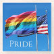 Ein heller Drink-Untersetzer mit einer blühenden Regenbogen-Pride-Fahne und einer amerikanischen Flagge, Set gegen einen blauen Himmel. Feiern Sie ein einladendes, vielfältiges Amerika. Foto in Cherry Grove auf der Feuerinsel. Teil der Pride-Sammlung.