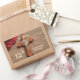 Neben einer schönen rote Rose befindet sich ein Rosarenkreuz aus Holz. Schönes Geschenk, Souvenir, Geschenk oder Party, das für die Feier mit einem Priester auf seinem Jubiläum der Ordination unverzichtbar ist. Passen Sie den Namen und das Jahr an.