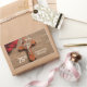 Neben einer schönen rote Rose befindet sich ein Rosarenkreuz aus Holz. Schönes Geschenk, Souvenir, Geschenk oder Party, das für die Feier mit einem Priester auf seinem 75. Jubiläum der Ordination unverzichtbar ist.