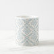 Verziertes, barocke Design der Damast Oberfläche Muster in einem hellen duskyblau-Detail auf einem cremefarbenen Hintergrund.