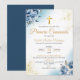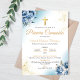 Machen Sie mit dieser eleganten katholischen Einladung die Erste Heilige Kommunion Ihres Kindes zu einem besonderen Erlebnis. Das goldene Kreuz und die niedlichen blauen Blumen verleihen dem Ganzen eine raffinierte religiöse Touch. Verfügbar auf Spanisch. Haz que la Primera Comunion de tu hijo Meer special con esta elegante Einladung católica. Cruz dorada y flores Azules.