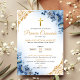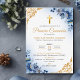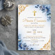Feiern Sie den besonderen Tag Ihres Kindes mit dieser religiösen und eleganten Einladung der Ersten Kommunion. Mit einem niedlichen goldenen Kreuz und blauen Blumen verkörpert es die Bedeutung einer katholischen Erstheiligen Kommunion. Verfügbar auf Spanisch. Celebra el día special de tu hijo con esta invitacion de Primera Comunion que tiene una cruz dorada y flores azules,
