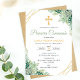Feiern Sie die Erste Heilige Kommunion Ihres Kindes mit dieser eleganten Einladung mit schönen Aquarellgrün-Blätter und einem zarten Kreuz. Diese religiöse Einladung spiegelt perfekt das Wesen einer katholischen Kommunion wider und verbindet Kultur und Raffinesse zu einem unvergesslichen Sake für diesen besonderen Tag. Celebra la Primera Comunión de tu hijo con esta elegante invitación, que presenta hermosas hojas verdes en acuarela y una delicada cruz. Esta invitación religiosa captura perfect tamente la esencia de una Comunión Católica, Combinando ternura y sofisticación para crear un recuerdo memorable para este día tan special.